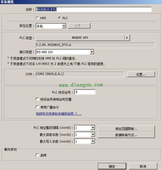 PLC 地址整段间隔 (words): 当画面上有多个相同的物件,如“设备类型”相同,“设备地址”不同,譬如有多个“数值显示元件”时,当 地址间隔小于或者等于此项设定值时,则人机界面会将读取这些数据的命令合并为一条命令 来读取这些数据。此项设定值如果设定为 0,则将取消合并命令功能。 举例来说,假设此项设定值为 5,当分别需从 LW3 读取 1 个 word 与从 LW6 读取 2 个 word 的数据(即读取 LW6 与 LW7 的内容)时,因 LW3 与 LW6 的地址差距小于 5,此时可以将此 两个命令合并为 1 个命令,合并后的命令内容为从 LW3 开始连续读取 5 个 word 的数据(读 取 LW3~LW7)。需注意,可以被合并的命令之读取数据大小将不会大于“最大读取字数 (words)”。