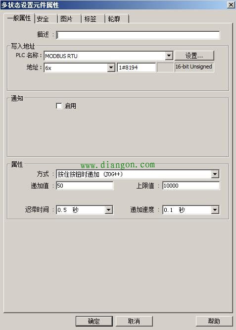 其中减速按钮的“多状态设置元件属性”如下图:其中PLC名称是MODBUS RTU,功能码是6X,地址1#8194,1代表1号变频器地址,#号后面的8194是10进制数,转为16进制是2002H是台达变频器修改变频器频率的寄存器地址。属性中“方式”和“递减值”等设置如下图: