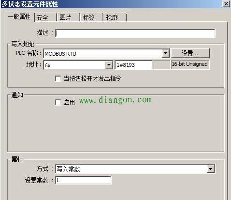 第二台变频器的加速按钮“多状态设置元件属性”设置如下图所示,和第一台变频器设置基本相同,只是地址为2#9194。