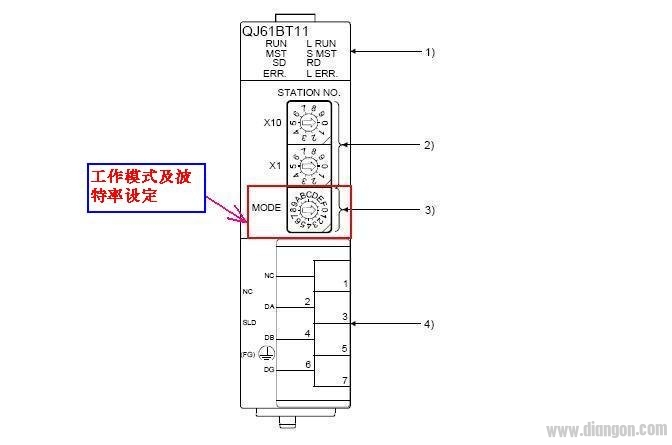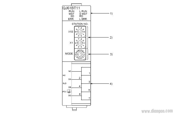 在主站plc上电后,首先从主站CC-LINK模块QJ61BT11前面板的LED指示灯对整个系统的通信状况做一个大致的了解。QJ61BT11前面板LED指示灯的名称和含义如下所示: