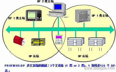 Profibus-DP允许构成单主站或多主站系统。在同一总线上最多可连接126个站点。系统配置的描述包括:站数、站地址、输入/输出地址、输入/输出数据格式、诊断信息格式及所使用的总线参数。每个PROFIBUS-DP系统可包括以下三种不同类型设备: