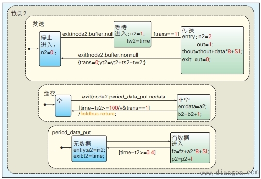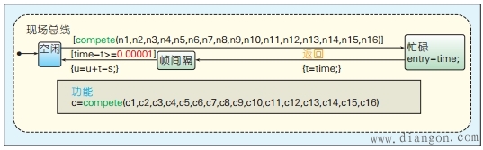 通信调度模块,如图2所示。包括总线活动模块fieldbus和仲裁判断函数compete.fieldbus模块包括3个状态:“空闲”、“忙碌”、“帧间隔”.开始总线在“空闲”状态下,当有节点要发送信息时,用compete函数对待发节点进行仲裁,并触发由“空闲”到“忙碌”的转换;节点发送数据完成后,以“返回”事件触发由“忙碌”到“帧间隔”的转换;经过一个“帧间隔”后,回到“空闲”状态,等待下一次传输。compete函数对各节点的仲裁符合CAN仲裁机制,通过比较各待发节点的优先级,实现“线与”功能,将发送权给优先级最高的节点。
