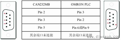 CPM系列PLC集成1个RS-232串行通讯端口,采用DB9孔型插座;CAN232MB转换器集成1个RS-232串行通讯端口,也采用DB9孔型插座。