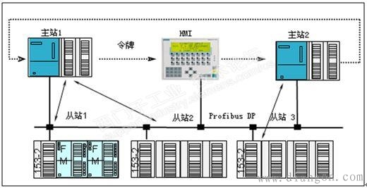 连接在PROFIBUS 网络上的主动站按照它们的地址顺序组成一个逻辑令牌环。令牌从低站地址到高站地址传递,传递到最高站地址126后,则跳回到最低站地址重新开始。获得令牌的主站可以在拥有令牌期间对属于它的从站进行发送或读取数据的操作。令牌只在主动站点间进行传递,PROFIBUS-DP从站通常为被动站点,不能得到令牌。如图所示,plc主站和hmi可以传递令牌,从站1、2、3不能得到令牌。PROFIBUS-DP通常为一主多从,主站轮询从站,保证通信的实时性。
