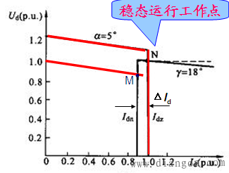 原因在于:整流侧用定电流控制可以控制触发角根据负载改变,定电压控制保持逆变侧触发角恒定,这样传输电流即功率传输大小可以通过整流侧触发角来控制.不过当整流侧触发角达到最小值(大概5°),就不能继续用定电流控制了,整流侧触发角只能恒定,也会变成定电压控制了。