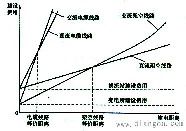 在某一输电距离下,两者总费用相等,达一距离称为等价距离。这是一个重要的工程初估数据。超过这一距离时,采用直流有利;小于这一距离时,采用交流有利。