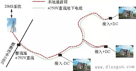 图1所示为一种LVDC系统的典型结构。分布式电源通过交直流转换单元接入,其电压变化范围为1500V到±750V。随着电力电子器件的发展,电力电子设备的能效将大为提高,从而可提高整个配电系统的能效。芬兰已有一批关于LVDC系统的试点项目在实施,图2为在芬兰某地配电网中安装LVDC的实例示意图。系统中DC电压为±750V,3个用户通过DC/AC换流器连接到直流电源。直流侧电容器的充电容量足以消除快速自动重合闸对用户的影响。在不久的将来,储能(电池)和小规模电源(如太阳能电池板)也将连接到直流电网中。