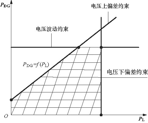 在不对分布式电源采取任何控制措施的条件下,分布式电源可接入容量必须同时满足3个约束条件(即分布式电源接入配电网引起的最大电压上偏差值与最大电压波动值不越限,以及无分布式电源接入配电网时单纯由负载引起的最大电压下偏差值不越限),这3条曲线共同围成的阴影部分区域就是不对分布式电源采取任何控制措施的条件下分布式电源的可接入容量范围,见图1。图中,PDG和PL分别表示分布式电源的容量和负荷功率。