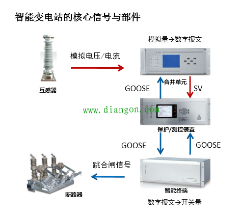 智能变电站是由智能化一次设备和网络化二次设备分层构建,是实现变电站内智能电气设备间信息共享和互操作的现代化变电站。智能化一次设备主要包括智能变压器、智能高压开关设备、电子式互感器等。例如:智能变压器与控制系统依靠通信光纤相连,可及时掌握变压器状态参数和运行数据。