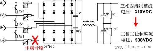 如上图所示,三相四线制全波整流,此电路好处在在三相电任意两相出现问题时,此供电电路任然可以继续工作。但是一旦整流电路中的中线中断或则未连接,此电路就变为三相三线制整流电路,此时电压有原来310VDC升高到538VDC,若后级设备无法承受538VDC高压,将后损坏后级设备。