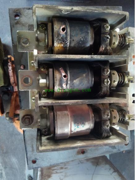 首先大家看到的是一家工厂内真空管炸裂烧毁的真空交流接触器。近年来由于较传统的CJ接触器灭弧性能好、使用寿命长等优点真空交流接触器在工控线路当中被广泛使用。就本例故障来说,实属典型的接触器选型不当造成的!该厂所控为三相380V;45KW异步电动机,为轻载直起方式。根据计算公式轻易可得该电机额定电流为85A(铭牌标注为86A),该机虽为轻载但启动电流依然高达400——500A。可是该电机所配真空交流接触器额定电流仅为250A!电动机频繁使用一段时间后,在大电流冲击的作用下,接触器真空灭弧室的真空度急剧下降,直至不堪重负而击穿炸裂!针对该故障本人建议这家工厂选用合适的软启动器或者变频器进行控制,不然故障很难根治。