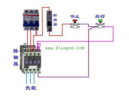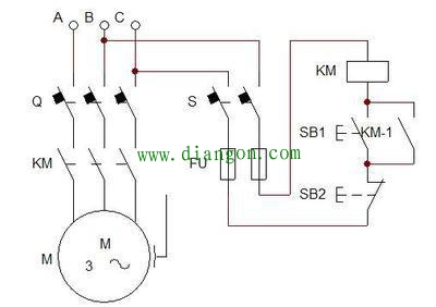 一般地,需要电机运行时,先合上主断路器、分断路器,当按下启动按钮时,控制电路回路通路,接触器电磁线圈得电吸合,接触器主触点吸合,电机 接通电源开始运行。同时接触器辅助常开触点闭合,松开启动按钮后,电机继续运转。