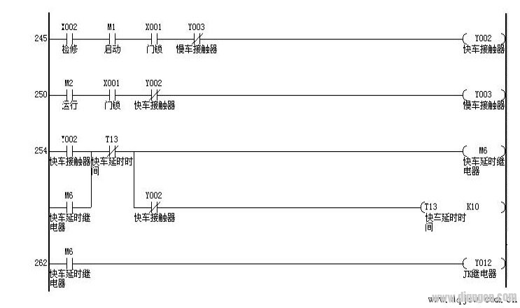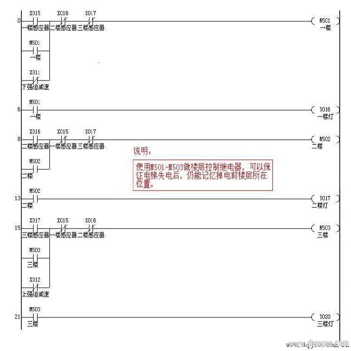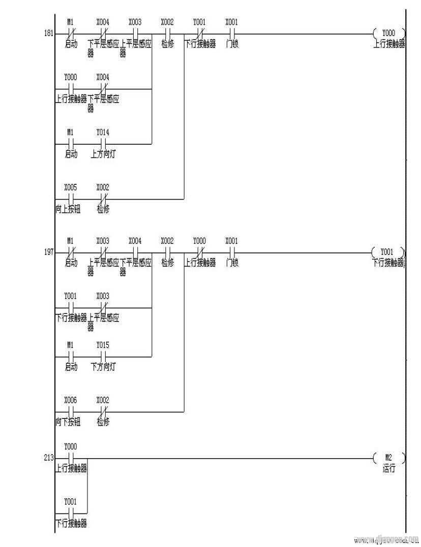这样,D200内的实际数值就反映了电梯的实际楼层数值,对D200进行解码,得出M501吸合时为1楼,M502吸合时为2楼,M503吸合时为3楼,M504吸合时为4楼。同时,电梯进行楼层翻转时也给出了电梯的减速信号。