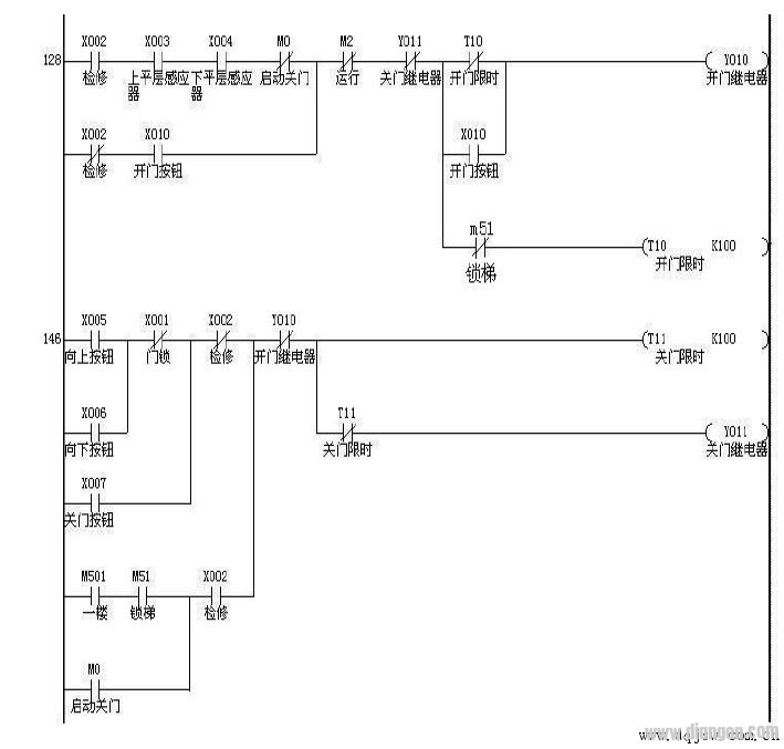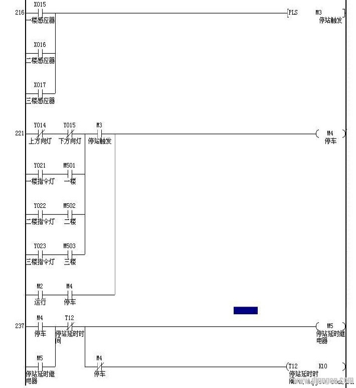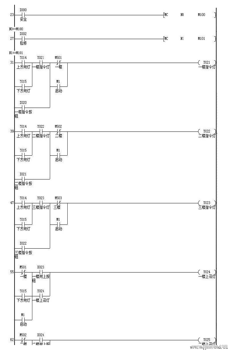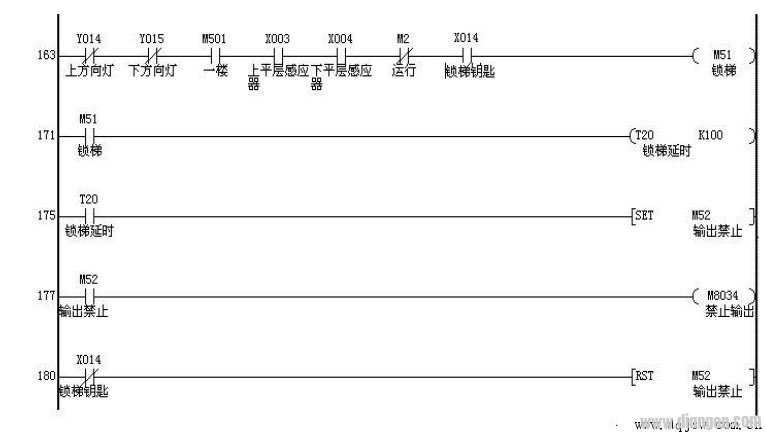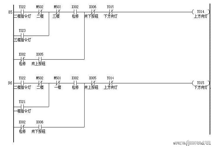 采用PLC作为中间过程控制的电梯电气控制,在电路原理图和安装接线图设计绘制完成后,还必须设计绘制与电路原理图对应的PLC梯形图程序,梯形图程
