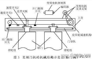 与变频门机控制系统的情况类似,对于不同厂家的电梯,变频门机机械系统的具体设计也会有所不同,但结构原理是基本一样。变频门机的机械系统分为两大部分:轿门侧机械部分和厅门侧机械部分,轿门和厅门通过一种称为“系合装置”的机械部件联接在一起,电机拖动轿门运动,轿门通过“系合装置”带动厅门一起运动。厅门侧机械部分除没有电机及其减速机构外,其余跟轿门侧机械部分相似,为节省篇幅,本文仅介绍轿门侧机械部分。变频门机轿门侧机械部分的结构示意图如图3 所示。