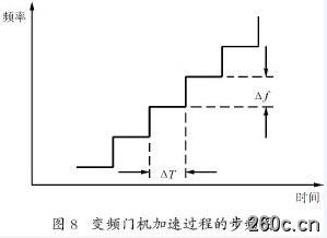 在图6 与图7 中,加速段与减速段的理想曲线都是连续的,但实际施加的速度信号是不连续的,而是通过步频来实现的,步频的概念请见图8,现以加速过程来说明步频的概念。图8 是从加速段理想曲线中选一小段放大,从图中可以看出,放大后呈阶梯状,在加速过程中,速度的增加是通过间隔时间驻T来增加频率驻f(电机电源频率)实现的,驻f称为步频。在设计理想曲线时,要先计算出加速过程需要多少时间,从而计算出步频的具体数值。步频的数值是频率分辨率的整数倍,比如对于频率分辨率为0.1 Hz的变频门机系统,步频的数值可为0.3 Hz、0.4 Hz 等,具体数值由设计者根据实际情况确定,步频的数值不能太大,否则在加减速时会出现振动。