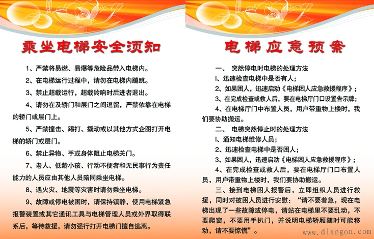 1、乘电梯时,请查看电梯是否有安全检验合格标志。超过检验日期或带故障的电梯,存在安全隐患。 2、不可未看清电梯轿厢是否停靠在本层的情况下盲目进入,否则有可能将导致人员坠落井道事故的发生。 3、候(乘)梯时不要踢、撬、扒、倚层门:否则有可能发生乘客坠入井道或被轿厢剪切等危险。 4、如果电梯满员,请耐心等待电梯的下一次服务。 5、电梯超载报警时不要挤入轿厢或搬入物品:否则将可能造成电梯不会关门,影响运行效率,情况严重时将导致曳引绳打滑,轿厢下滑,甚至造成人员剪切等事故的发生。 6、不要用手、脚或物品阻止轿厢门的关闭,需要使电梯门保持打开状态,可按住轿厢内的开门按钮。进出电梯时行动不要过分迟缓,不要长时间一脚踩楼层一脚踩轿厢,否则万一此时轿厢动起来,易发生剪切事故。 7、在电梯运行时尽量离开门口站立,可以利用轿厢内的扶手,站稳扶好。 8、电梯到站停止后如果不开门,可以按开门按钮打开轿厢门,不可强行打开轿厢门,否则很可能发生坠落井道事故。 9、不要在运动的电梯内嬉戏玩耍、打闹、跳跃和乱摁按钮,否则特别容易导致电梯安全装置误动作,发生“困人”以及伤亡事故。 10、当电梯出现故障卡在层间时,请不必惊慌,最安全的对策是处变不惊,轿厢和井道通风良好,空气充足,电梯设有多项保证乘客安全的措施,可以利用轿厢内设警报按钮或电话唿救物业部门和维保单位,耐心等待救援。切勿试图通过其他危险方式离开电梯。 |