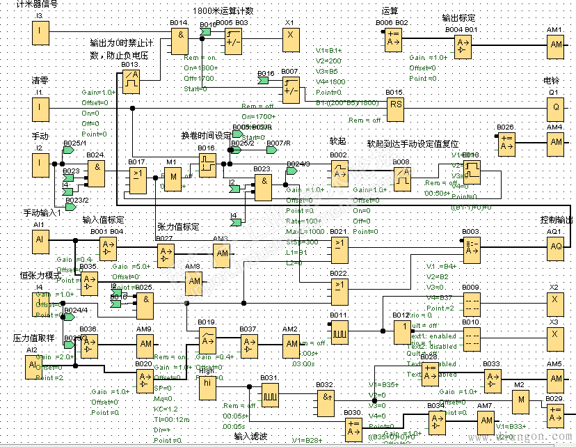 这里面用了LOGO!的PID,初始设置的是压力模式,然后经过微调,达到了较好的控制效果。用斜坡函数发生器及滤波器用来缓冲切换时的电压冲击。