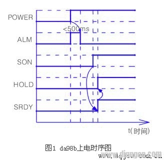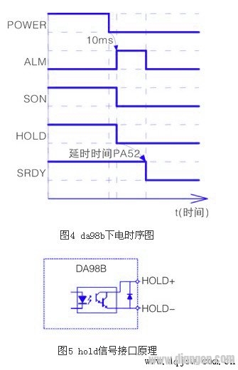 da98b下电时序见图4。得出使用hold信号进行失电制动器控制完全可以满足上电、下电、伺服报警等不同情况的抱闸控制的要求。da98b的hold信号采用集电极开路输出,接口原理如图5所示。