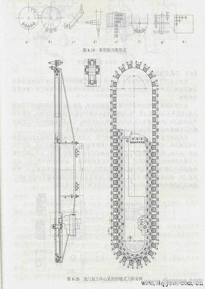 根据刀库所需要的容量和取刀的方式,可以将刀库设计成多种形式。图8-19列出了最常用的几种。图8-19a~d是单盘式刀库,为适应机床主轴的布局,刀库的刀具轴线可以按不同的方向配置(如图8-19a~c),图8-19d是刀具可作90º翻转的圆盘刀库,采用这种结构能够简化取刀动作。单盘式刀库的结构简单,刀库的容量通常为15~30把,取刀比较方便,因此应用最为广泛。图8-19e是鼓轮弹仓式(又称刺猬式)刀库,其结构十分紧凑,在相同的空间内,它的刀库容量较大,但选刀和取刀的动作较复杂。图8-19f是链式刀库,其结构有较大的灵活性,存放刀具的数量也较多,选刀和取刀动作十分简单。当链条较长时,可以增加支承链轮的数目,使链条折叠回绕,提高了空间的利用率。图8-19g和8-19h分别为多盘式和格子式刀库,它们虽然也具有结构紧凑的特点,但选刀和取刀动作复杂,应用较少。刀库的容量一般为10~60,但随着加工工艺的发展,目前刀库的容量似乎有进一步增大的趋势。图8-20为一龙门式加工中心采用的链式刀库实例,图8-21为一立式加工中心的圆盘式刀库实例。