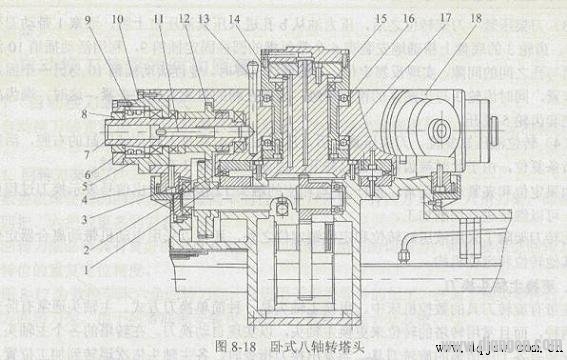 图8-18为卧式八轴转塔头。转塔头上径向分布着八根结构完全相同的主轴7,主轴的回转运动由齿轮12输入。当数控装置发出换刀指令时,先通过液压拨叉将移动齿轮3与齿轮12脱离啮合,同时在中心液压缸14的上腔通压力油。由于活塞杆和活塞15固定在底座上,因此中心液压缸14带着由两个推力轴承17和16支承的转塔刀架体18抬起,离合器2和1脱离啮合。然后压力油进入转位液压缸,推动活塞齿条,再经过中间齿轮使大齿轮4与转塔刀架体18一起回转45º,将下一工序的主轴转到工作位置。转位结束后,压力油进入中心液压缸14的下腔,使转塔头下降,离合器2和1重新啮合,实现了精确的定位。在压力油的作用下,转塔头被压紧,转位液压缸退回原位。最后,通过液压拨叉移动齿轮3,使它与新换上的主轴齿轮12相啮合。为了改善主轴结构的装配工艺性,整个主轴部件装在套筒5内,只要卸去螺钉10,就可以将整个部件抽出。主轴前轴承9采用锥孔双列圆柱滚子轴承,调整时,先卸下端盖6,然后拧紧螺母8,使内环做轴向移动,以便消除轴承的径向间隙。