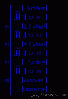 (四)PLC控制系统的软件设计 本机床PLC控制系统的软件由公用程序、全自动程序、半自动程序、手动程序、全线自动回原点程序以及故障报警程序等六部分组成,程序总体结构图如图1所示。