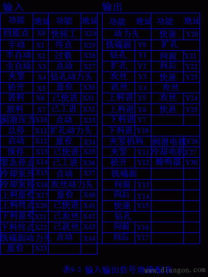 一 、概述 四工位组合机床由四个工作滑台各载一个加工动力头,组成四个加工工位完成对零件进行铣端面、钻孔、扩孔和攻丝等工序的加工,采用回转工作台传送零件,有夹具、上、下料机械手和进料器四个辅助装置以及冷却和液压系统。系统中除加工动力头的主轴由电动机驱动以外,其余各运动部分均由液压驱动。机床的四个动力头同时对一个零件进行加工,一次加工完成一个零件。 二、控制要求和工作方式 本机床共有连续全自动工作循环、单机半自动循环和手动调整三种工作方式。连续全自动和单机半自动循环的控制要求为:按下启动按钮,上料机械手向前,将待加工零件送到夹具上,同时进料装置进料,然后上料机械手退回原位,进料装置放料,回转工作台自动微抬并转位,接着四个工作滑台向前,四个动力头同时加工,加工完成后,各工作滑台退回原位,下料机械手向前抓住零件,夹具松开,下料机械手退回原位并取走已加工完的零件,完成一个工作循环,并开始下一个工作循环,实现全自动工作方式。如果选择预停,则每个工作循环完成后,机床自动停止在初始位置,等到再次发出启动命令后,才开始下一个循环,这就是半自动循环工作方式。 三、系统的硬件构成 本组合机床由plc组成的电控系统共有各种输入信号约37个,输出信号25个。输入元件中包括工作方式选择开关、启动、预停、急停按钮,用于检测各工位工作进程的行程开关和压力继电器等等。输出元件包括控制各动力头主轴电动机运行的接触器线圈,控制各工位向前与向后、快速以及攻丝、退丝、夹紧、松开的电磁换向阀线圈。根据组合机床的工作特点,选用三菱FX2N―64MR型PLC,即可满足输入输出信号的数量要求,同时由于各工位动作频率不是很高,但控制线路电流较大,故选用继电器输出方式的PLC,系统的输入输出信号地址分配表如下表所示。