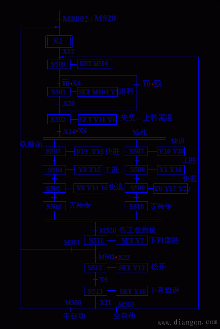 图2 公用程序梯形图 故障报警程序包括故障的检测与显示,故障检测由传感器完成,再送入PLC,故障显示采取分类组合显示的方法,将所有的故障检测信号按层次分成组,每组各包括几种故障,本系统分为:故障区域,故障部件(动力头、滑台、夹具等),故障元件三个层次。当具体的故障发生时,检测信号同时送往区域、部件、元件三个显示组。这样就可以指示故障发生在某区域、某部件、某元件上。 全自动程序是软件中最重要的部分,它用来实现组合机床在无人参与的情况下对成批工件进行自动地连续加工。在全自动工作方式下,当机床具备所有初始条件后,按下启动按钮(X12),机床即按控制要求所述工艺过程工作,各动力头进行各自的工作循环,循环结束时重新回到各自的初始位置并停止。本文以铣端面和钻孔工位为例,着重分析全自动程序的设计,结合表1I/O地址的分配,可以画出这两个工位的状态流程图如图3所示。
