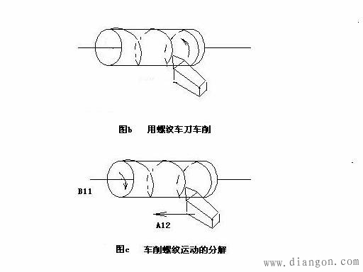 图b螺纹车刀切削螺纹。螺纹车刀是成型刀具,形状相当于螺纹沟槽的截面。因此,形成螺旋面只需要 一个运动;车刀相对于工件作螺纹运动。因此,把这个螺旋运动分解成等速旋转运动和等速直线运动,在图c中,以B11和A12代表。这样的运动称为复合的表面成型运动或简称复合成型运动。为了得到一定导程的螺旋线, 运动的2个部分B11和A12必须严格保持相对关系,即工件每转1转,刀具的移动量计应为1个工件螺纹导程。