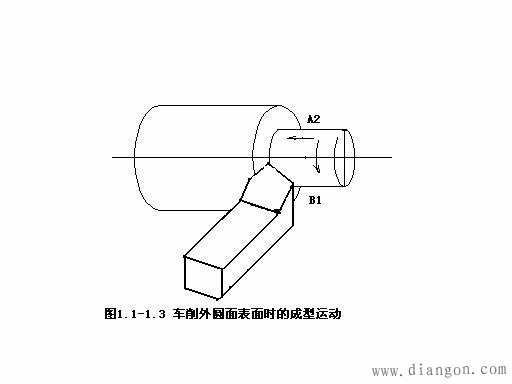 工件的旋转运动B1产生母线(圆);刀具的纵向直线运动B2产生导线(直线)。运动B1和B2表面成型的2个运动。