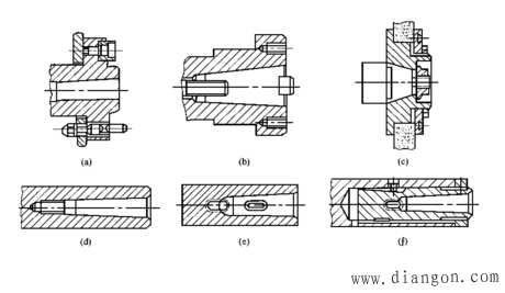 数控机床的主轴部件包括主轴、主轴的支承轴承和安装在主轴上的传动零件等。主轴部件是机床的重要部件,其结构的先进性已成为衡量机床水平的标志之一。由于数控机床的转速高、功率大,并且在加工过程中不进行人工调整,因此要求主轴部件具有良好的回转精度、结构刚度、抗振性、热稳定性、耐磨性和精度的保持性。对于具有自动换刀装置的数控机床,为了实现刀具在主轴上的自动装卸和夹紧,还必须有刀具的自动夹紧装置、主轴准停装置等。 机床主轴的端部一般用于安装刀具、夹持工件或夹具。在结构上,应能保证定位准确、安装可靠、连接牢固、装卸方便,并能传递足够的扭矩。目前,主轴端部的结构形状都已标准化,图1所示为几种机床上通用的结构形式。 (a)数控车床主轴端部 (b)铣、镗类机床主轴端部 (c)外圆磨床砂轮主轴端部 (d)内圆磨床砂轮主轴端部 (e)钻床与普通镗床锤杆端部 (f)数控镗床主轴端部 图1 机床主轴的几种结构形式 |