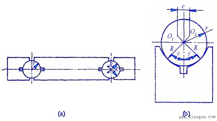 为使双圆弧滚珠导轨既能发挥接触面积较大,变形较小的优点,又不致于过分增大摩擦力,应合理确定双圆弧滚珠导轨的主要参数(见图3(b))。根据使用经验, 滚珠半径r与滚道圆弧半径R之比常取为r/R=0.90~0.95,接触角θ= 45°。