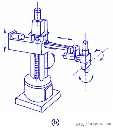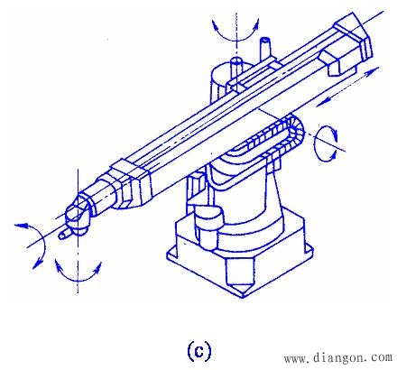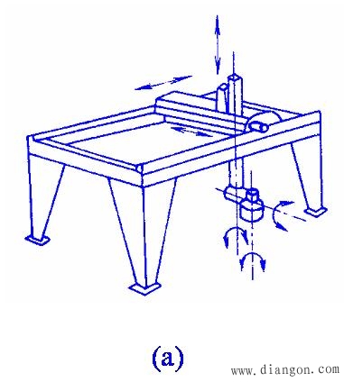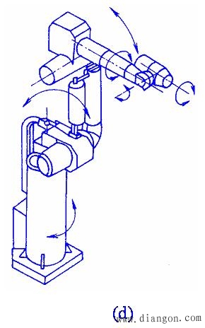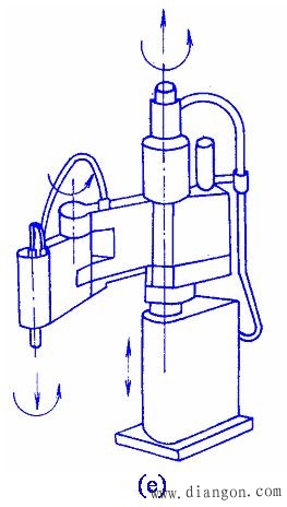 工业机器人是一种可编程的智能型自动化设备,是应用计算机进行控制的替代人进行工作的高度自动化系统。 机器人是从初级到高级逐步完善起来的,它的发展过程可以分为三代。 第一代机器人是目前工业中大量使用的示教再现型机器人,它主要由夹持器、手臂、驱动器和控制器组成。 第二代机器人是带感觉的机器人,它具有一些对外部信息进行反馈的能力,诸如力觉、触觉、视觉等。 工业机器人一般由主构架(手臂)、手腕、驱动系统、测量系统、控制器及传感器等组成。 图1 是工业机器人的典型结构。     图2 工业机器人的基本结构形式 (a)直角坐标型;(b)圆柱坐标型; (c)球坐标型;(d)多关节型; (e)平面关节型 |