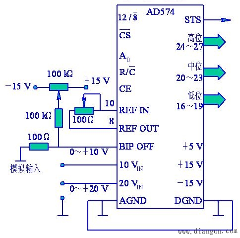 AD574是一个完整的12位逐次逼近式带三态缓冲器的A/D转换器,它可以直接与8位或16位微型机总线进行接口。AD574的分辨率为12位,转换时间为15~35μs。AD574有6个等级,其中AD574AJ、AD574AK和AD574AL适合在0~+70℃温度范围内工作,AD574AS、AD574AT和AD574AV适合在-55~+125℃温度范围内工作。