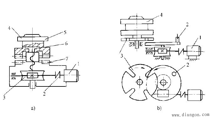 例如:车床上的手动转位刀架改成自动转位刀架。图3a中,1-电动机、2-安全离合器、3-蜗轮蜗杆、4-内装信号盒、5-刀架、6-螺母、7-端齿盘。图3b中,1-电动机、2-销钉盘、3-十字槽轮、4-刀架。