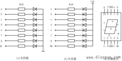 上图为七段LED显示器的结构图。将发光二极管组成阵列,封装于标准外壳内,可构成各种发光二极管显示器,即LED显示器。机电系统中的人机接口中,以七段LED显示器最为常用。为适应不同驱动电路,引线有共阳极和共阴极两种结构。用七段LED显示器可以显示0~9等十个数字和少数字母。显示器中还有一个小数点显示段,所以共计八段,分别用