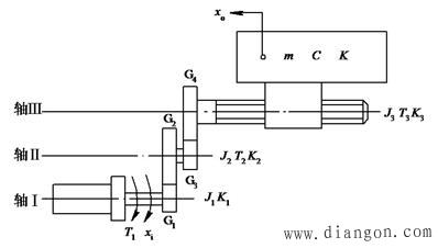 建立该系统的数学模型,首先是把机械系统中各基本物理量折算到传动链中的某个元件上(本例折算到轴I上),使复杂的多轴传动关系转化成单一轴运动,转化前后的系统总机械性能等效;然后,在单一轴基础上根据输入量和输出量的关系建立它的输入/输出的数学表达式(即数学模型)。根据该表达式进行的相关机械特性分析就反映了原系统的性能。(http://www.diangon.com/版权所有)在该系统的数学模型建立过程中,我们分别针对不同的物理量(如J、K、ω)求出相应的折算等效值。