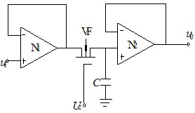 3. 信号采样与保持 所谓采样,就是把时间连续的信号变成一串不连续的脉冲时间序列的过程。信号采样是通过采样开关来实现的。采样开关又称采样器,实质上它是一个模拟开关,每隔时间间隔T闭合一次,每次闭合持续时间τ,其中,T称为采样周期,其倒数fs=1/T称为采样频率,τ称为采样时间或采样宽度,采样后的脉冲序列称为采样信号。采样信号是一个离散的模拟信号,它在时间轴上是离散的,但在函数轴上仍是连续的,因而还需要用A/D转换器将其转换成数字量。 A/D转换过程需要一定时间,为防止产生误差,要求在此期间内保持采样信号不变。实现这一功能的电路称采样/保持电路。典型的采样/保持电路由模拟开关、保持电容和运算放大器组成,如下图所示。