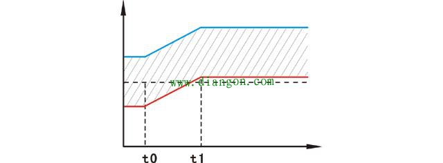 正偏差和负偏差对控制器输出的影响如图2所示,图中比例度的中线对应于控制器在控制点时的输出,在只有比例作用时输出是一个常数,即比例度的中线不会改变。当加入积分作用后,这条中线就随时间而改变了,改变的速度与积分时间成反比。这时控制器的输出就是比例输出与积分输出之和:积分输出就是这条改变的中心线,所以总输出表现为以控制点为中心的一条带子。