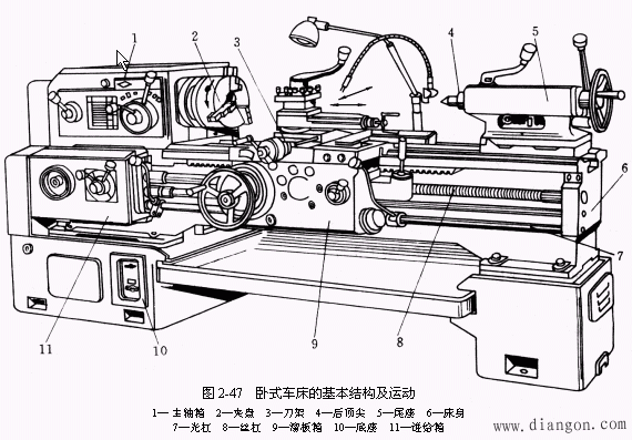 | 各类机床通常都由下列基本部分组成: 1)动力源 为机床提供动力(功率)和运动的驱动部分,如各种交流电动机、直流电动机和液压传动系统的液压泵、液压马达等。 2)传动系统 包括主传动系统、进给传动系统和其他运动的传动系统,如变速箱、进给箱等部件,有些机床主轴组件与变速箱合在一起成为主轴箱。 3)支撑件 用于安装和支承其它固定的或运动的部件,承受其重力和切削力,如床身、底座、立柱等。支承件是机床的基础构件,亦称机床大件或基础件。 4)工作部件 包括:① 与主运动和进给运动的有关执行部件,例如主轴及主轴箱,工作台及其溜板或滑座,刀架及其溜板,以及滑枕等安装工件或刀具的部件;② 与工件和刀具有关的部件或装置,如自动上下料装置、自动换刀装置、砂轮修整器等;③与上述部件或装置有关的分度、转位、定位机构和操纵机构等。不同种类的机床,由于其用途、表面形成运动和结构布局的不同,这些工作部件的构成和结构差异很大。 5)控制系统 控制系统用于控制各工作部件的正常工作,主要是电气控制系统,有些机床局部采用液压或气动控制系统。数控机床则是数控系统。 6)冷却系统 7)润滑系统 8)其他装置 如排屑装置,自动测量装置等。 图2-47~2-53所示分别为车床、铣床、钻床、镗床、磨床和加工中心的基本结构,请读者特别注意其主运动与进给运动。 |
