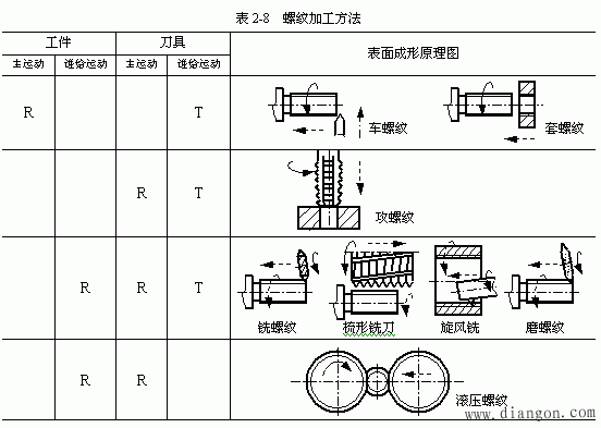| 表2-8列出了几种常用的螺纹加工方法。 1)车螺纹 螺纹车刀结构简单,通用性好,可用于加工各种尺寸、形状和精度的内外螺纹。但加工效率较低,多用于单件小批生产。 2)攻螺纹和套螺纹 用丝锥攻螺纹和用板牙套螺纹常用于加工精度要求不高的标准内、外螺纹。 3)盘形铣刀铣螺纹 主要用于加工大螺距的梯形螺纹及蜗杆。 4)梳形铣刀铣螺纹 梳形螺纹铣刀相当于若干把盘形铣刀的组合,一般在专用的螺纹铣床上加工短而螺距不大的内、外螺纹。 5)旋风铣螺纹 利用装在特殊旋转刀盘上的硬质合金刀头进行内、外螺纹的高速铣削,是一种高效率的加工方法。 6)磨螺纹 是一种高精度的螺纹加工方法,主要用于加工外螺纹。 7)滚压螺纹 是一种高效率的螺纹加工方法。它利用压力加工方法使金属材料产生塑性变形以形成螺纹,所用工具有滚丝轮和搓丝板。 |