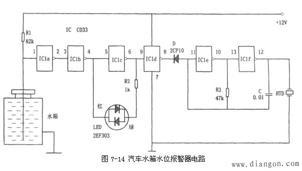 当水箱内水位正常(最低水位以上)时,探测器与水箱体之间的电阻较小,结果IC1a的输入端为低电平,相应IC1c输出高电平,LED中的绿灯变亮,指示水位正常。同时IC1d输出低电平使D导通,相应IC1e和IC1f组成的振荡器停振,HTD不发声,电路不发生报警。汽车水箱中的水量减少,将直接影响汽车正常安全行驶,而该报警器恰能在水箱水位处于最低水位以下时发出声光报警,及时提醒驾驶员加水,避免事故发生。