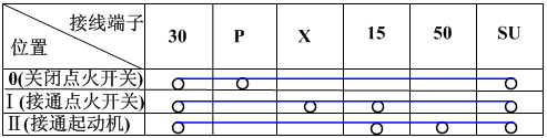 其中:30-接蓄电池 P-接停车灯 X-接卸荷工作电源 15-接点火电器 50-接起动机 SU-接蜂鸣器电源