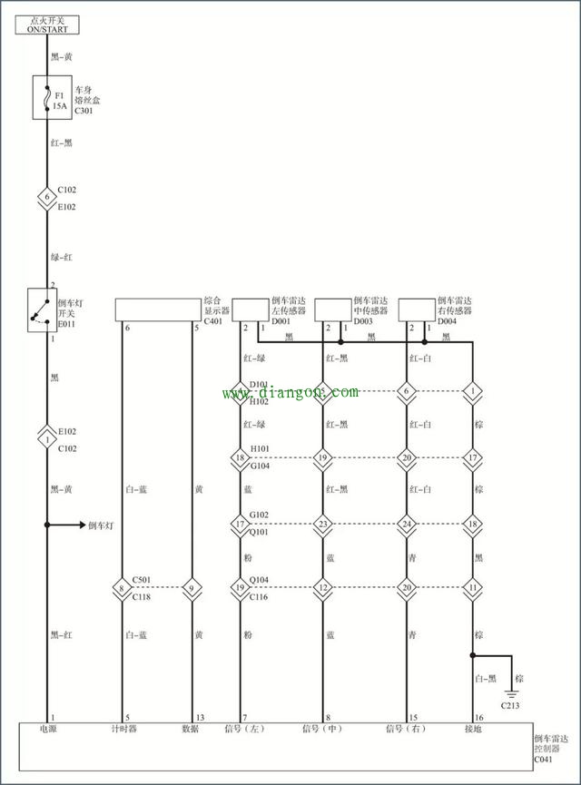 ④ 倒车雷达控制器端子5 和13 连接至综合显示器端子6 和5,进行数据传送,将倒车雷达控制器的信息反映到综合显示器上。