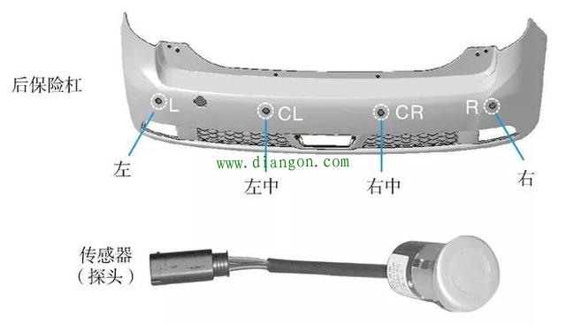 倒车雷达传感器俗称探头,安装在后保险杠上,包括左、左中、右中、右传感器,由外向内嵌入式安装,如下图所示。各传感器的安装位置都有规定,不能装错,否则可能引起误报警。