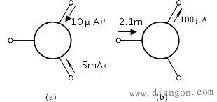 5、实际中测得放大电路中三极管两个电极的电流如图,分析另一电极电流的大小和实际方向,并判断管型。  |