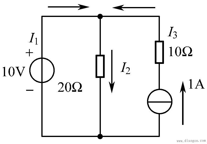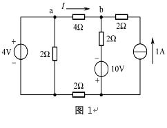 Uoc=4v+10v-2v=12v Ro=2Ω+2Ω=4Ω 接入断开支路如图所示则: I=12v/4Ω+4Ω=1.5A  3、求图中各支路电流,并计算电压源和电流源的功率,确定是吸收还是发出功率。 解:I2=10V/20Ω=0.5A I1=-(1A-0.5A)=-0.5A Pus=-UI1=10V*0.5A=5W Pis=-UisIs=-(10v+10Ω*1A)*1A=-20W