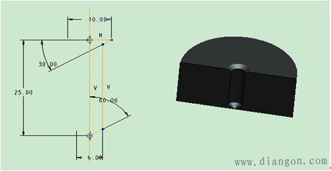 | 说明:若要在凸凹面上建立孔特征,还要自行建立参照;孔形分为直孔和草绘孔。直孔如图7。草绘孔如图8,草绘孔是使用草绘方式绘制孔的形状,选择“草绘”,进入草绘模式。草绘孔不能在柱面上建立,适合于异形孔的造型,草绘孔实体特征如图9。 |
