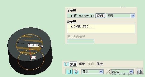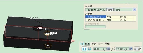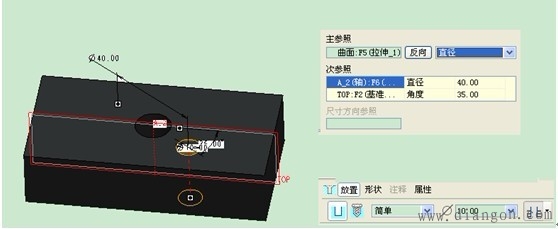 | (2)径向定位:指定一个基准轴与角度参考平面,并输入与圆孔与基准轴的距离及与参考面的夹角来产生圆孔,如图4。 |