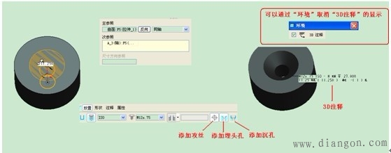 (2)创建标准孔:增加倒角→增加沉孔,侧1表示单箭头方向深度。 (3)要改变孔的注释的内容,则在完成孔的创建后,单击“设置”|“注释”|“修改”,选择注释并编辑文本。 |